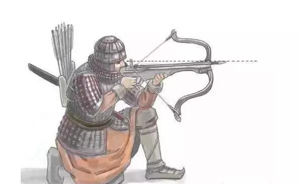 弩的射击方式一般以平射或微角仰射为主,图为操弩准备射击的弩兵