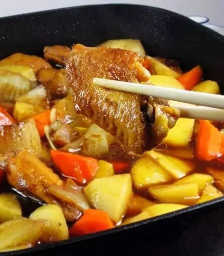 食材:鸡翅1000g、胡萝卜200g、土豆200g、洋葱200g、油适量、姜片适量、蚝油1杯、可乐1杯、红酒1杯