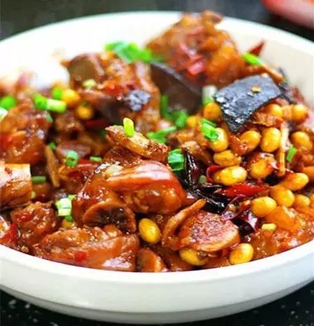 11)煮至水份充分被黄豆吸收,加入适量鸡精,炒匀,就可以起锅装盘了,最后撒上葱花,真是香啊!
