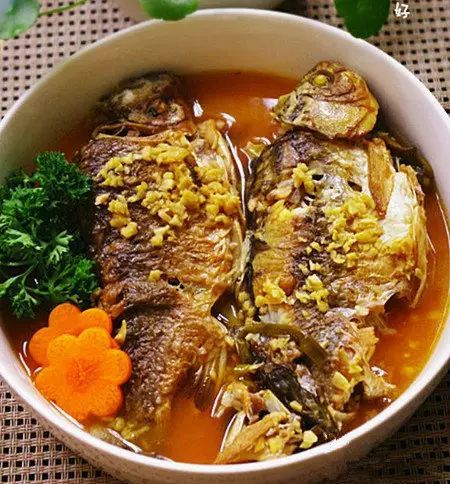9)将生姜切片铺于鱼身上,再放上些葱段,倒入清水1小碗(水不用太多,不会糊底就行);