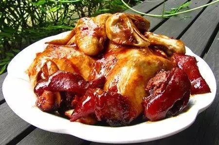 食材:三黄鸡1只、蹄花0.5个、五花肉100g、黄酒适量、酱油适量、冰糖适量、鲍鱼汁适量、腐乳汁适量、姜适量、小葱适量