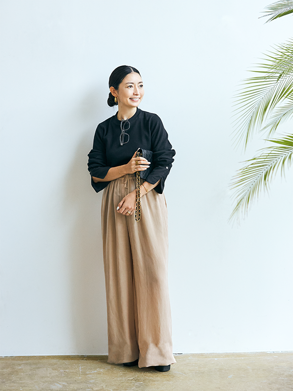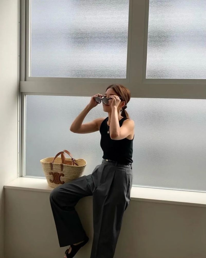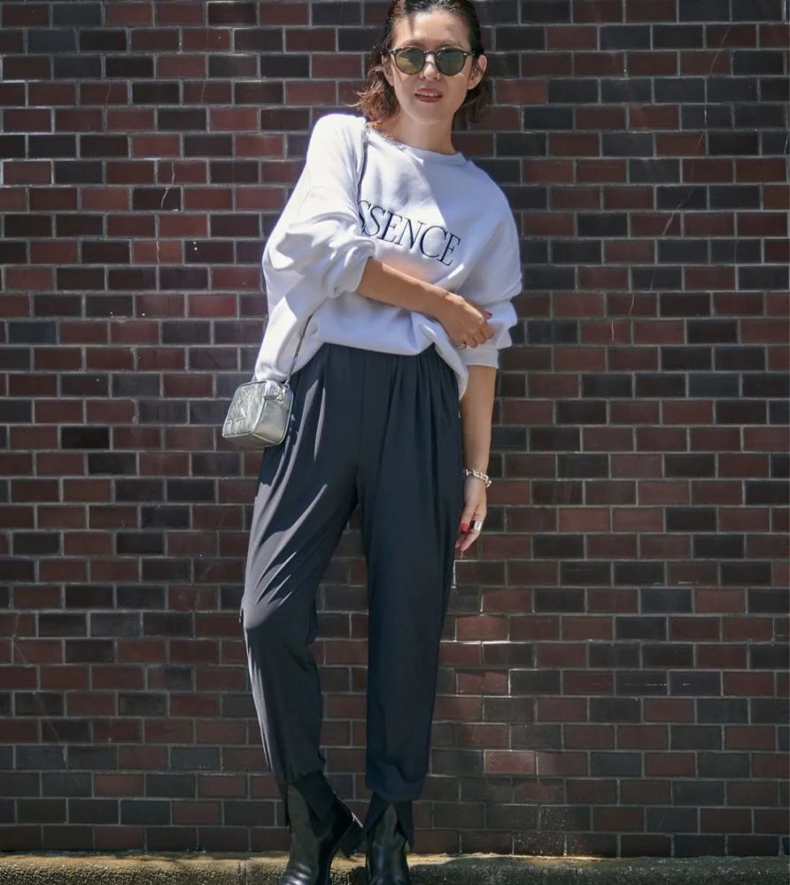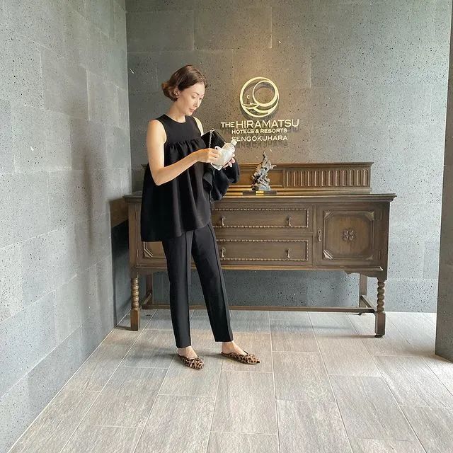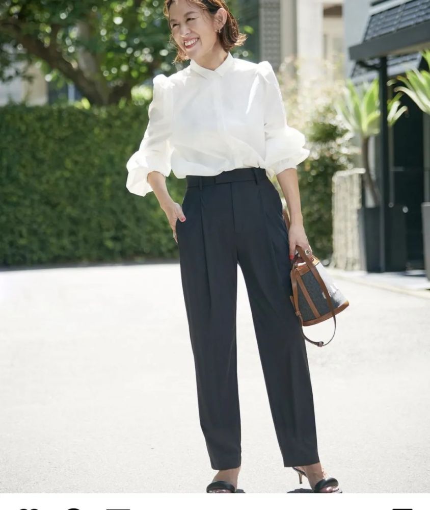 这是她的日常穿搭,也是看到了黑色的有裤缝的西裤,每个人对黑色长裤有不同的搭配理解,在田丸麻纪这里就选择了荷叶边可爱一点的上衣,更休闲一点,包括鞋子都是很摩登的。
