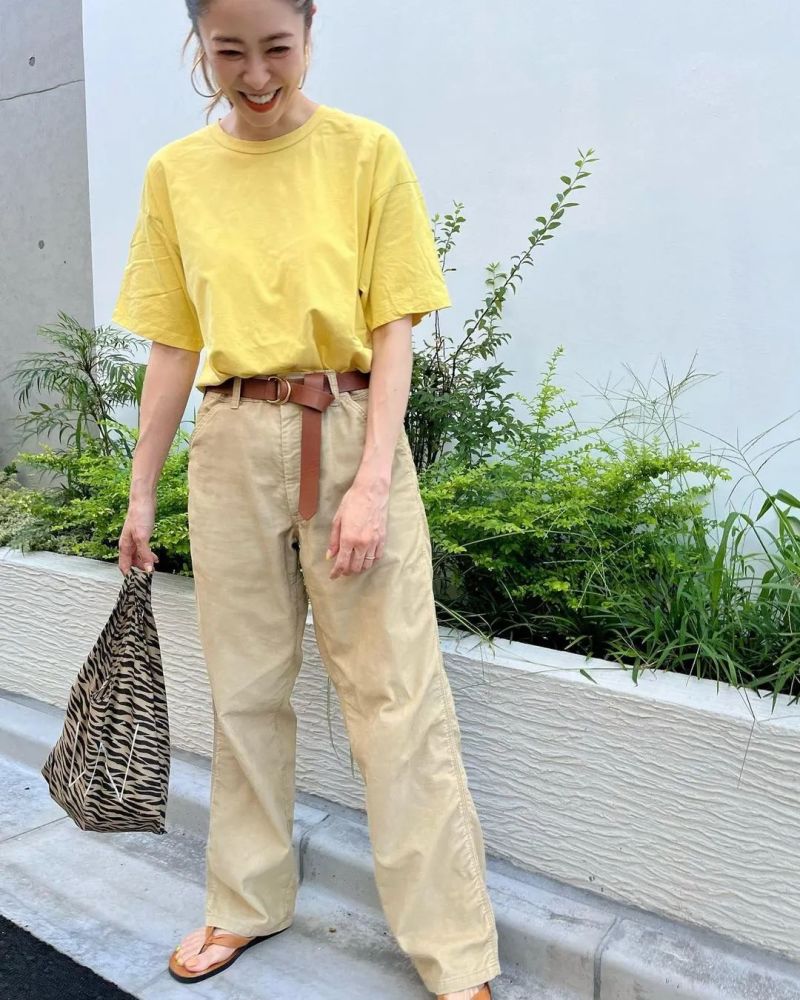fumiko上周的街拍主题是黄色和橘色,她可以说是暖色的代言人了。这件黄色T恤好像还是男款,搭配了卡其色长裤,这个配色真的又有活力又能让你体会到博主本人的个人魅力和自信。