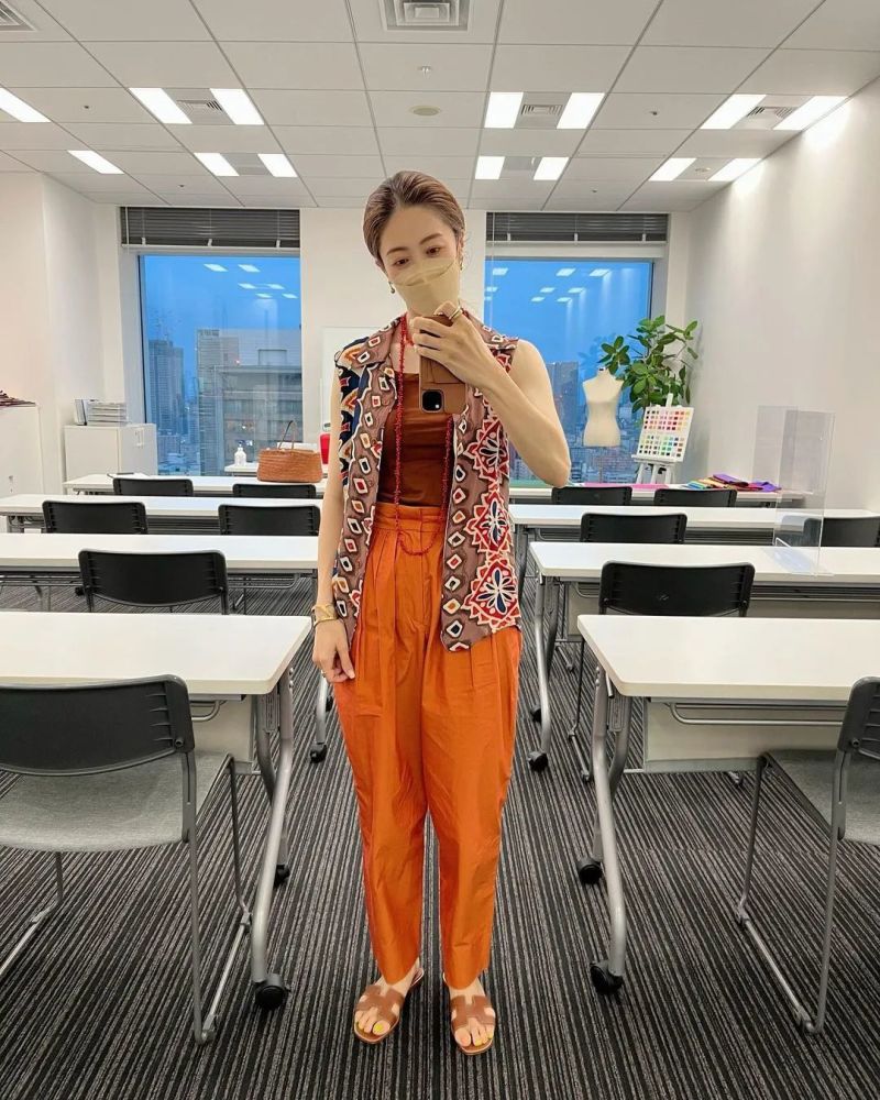 这两套日常都用到了橘色的单品,而且搭配她还选择了类似色撞色和印花,会不会觉得这个配色其实也很秋天。