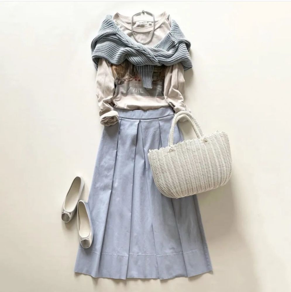 Kao上周的这套搭配,颜色清新脱俗,上衣用到了长袖T恤,搭配雾霾蓝的半裙,配色高级内敛,整个配饰到单品都很低调,但是整体造型却很亮眼。
