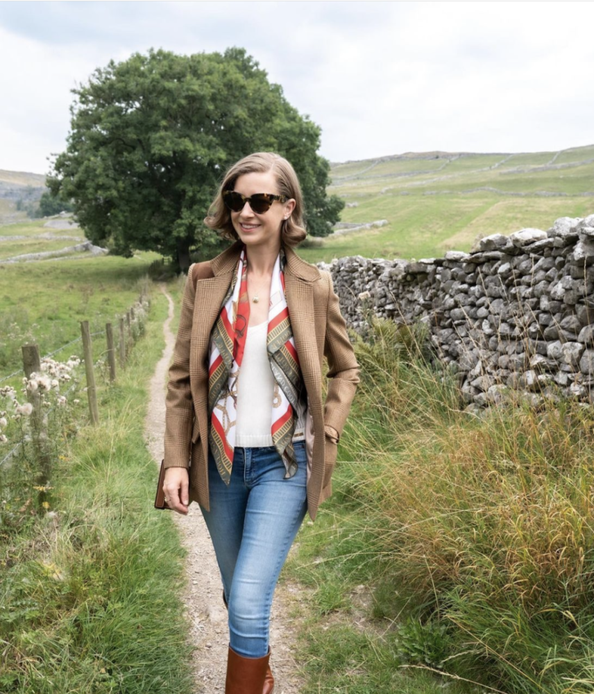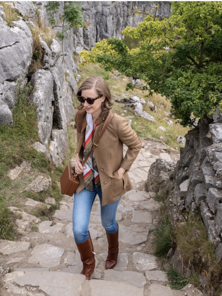 来自美国的博主Stacie Flinner的这套搭配一看就是进入到秋天中后段了。喜欢穿靴子的我第一眼就被靴子吸引,整体搭配配色很秋天之外,那条丝巾也很突出,丝巾靴子?买起来!