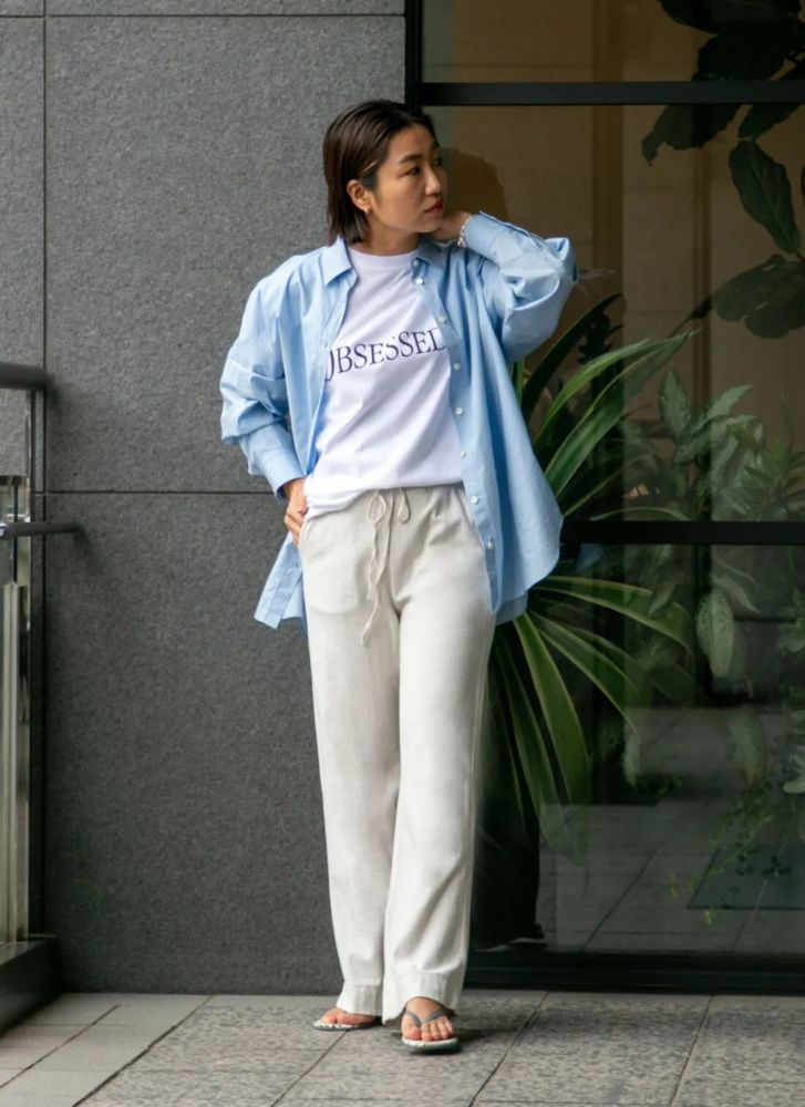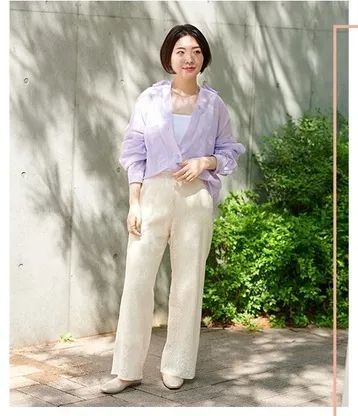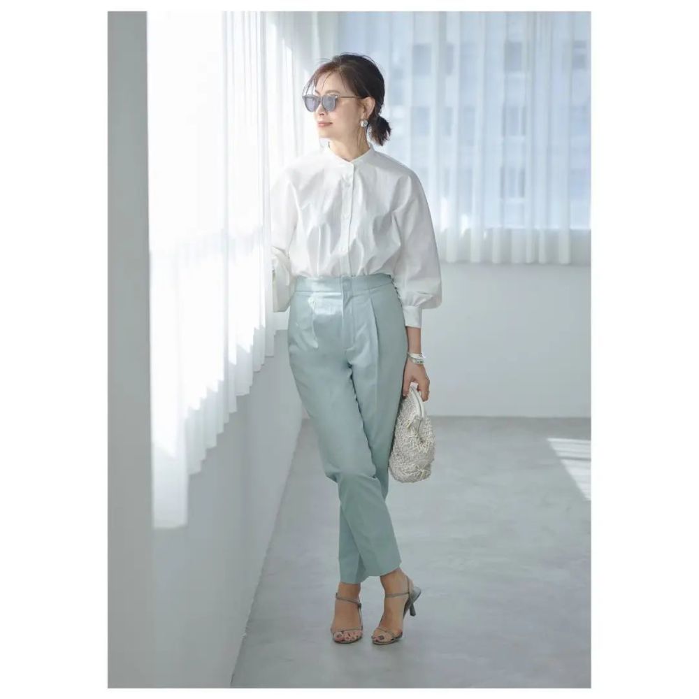上周三寻木的搭配同样是上下分开的。衬衫廓形女人味十足,灯笼袖遮住了胳膊有肉肉的地方,长裤是垂坠的西裤,且有裤缝,有线条感的同时颜色也很适合夏天,清凉又淡雅。
