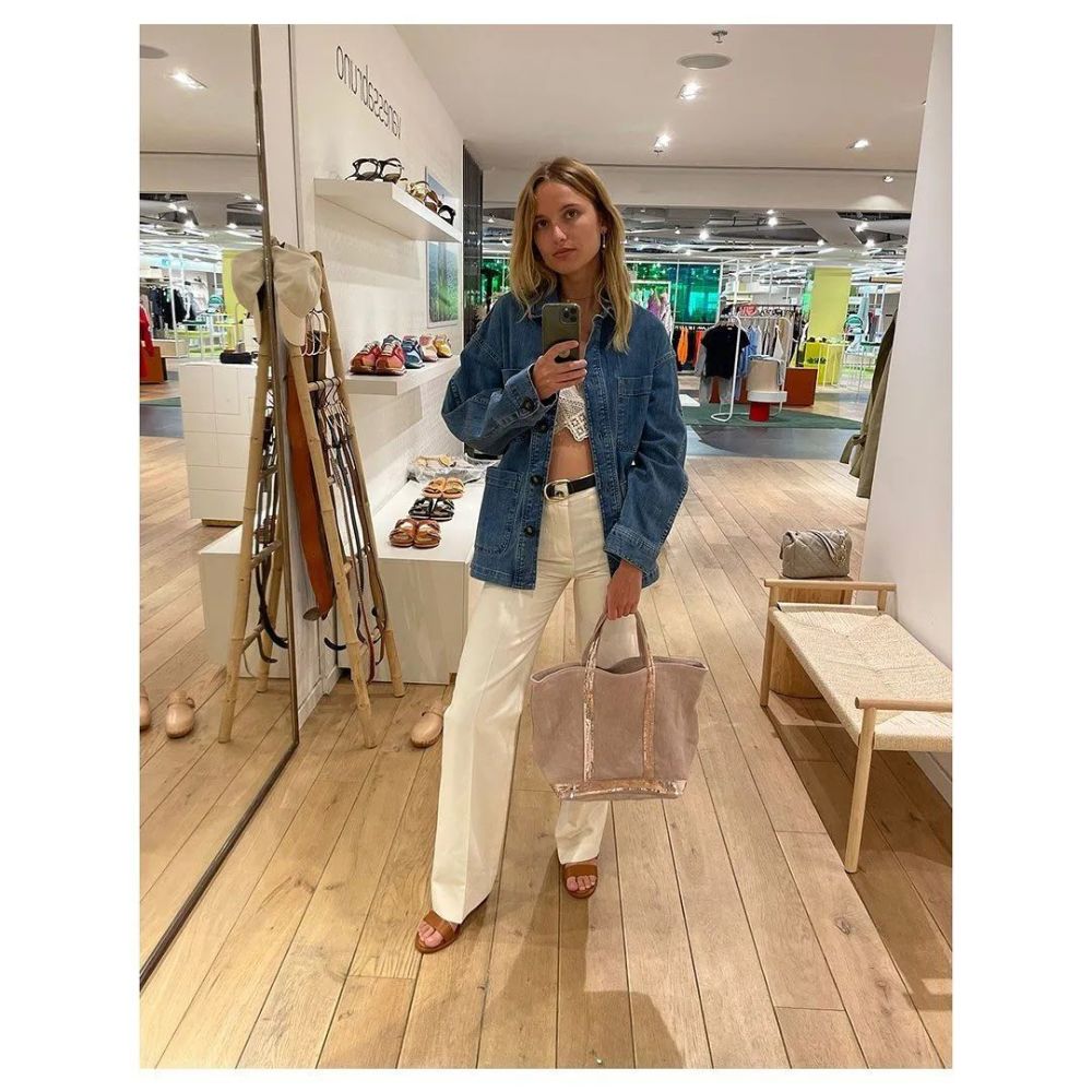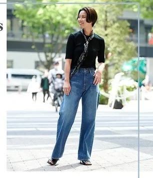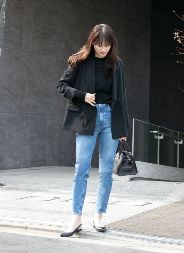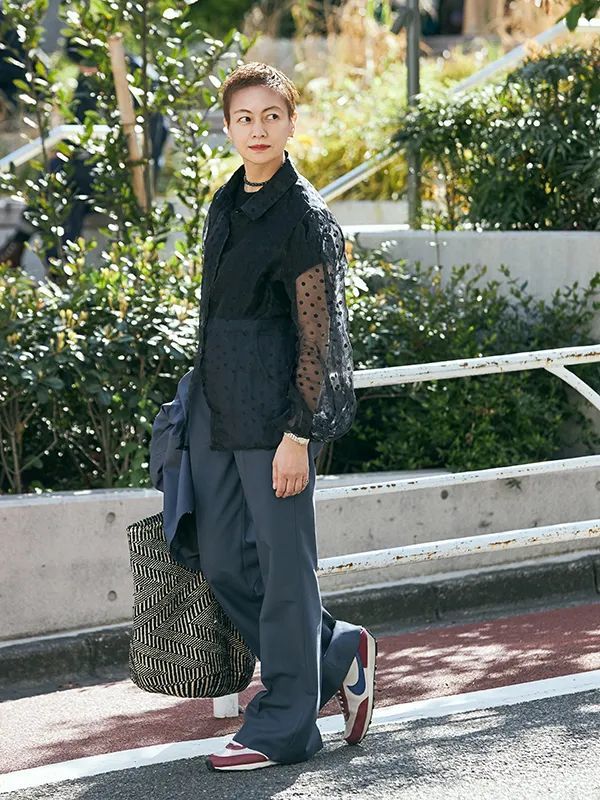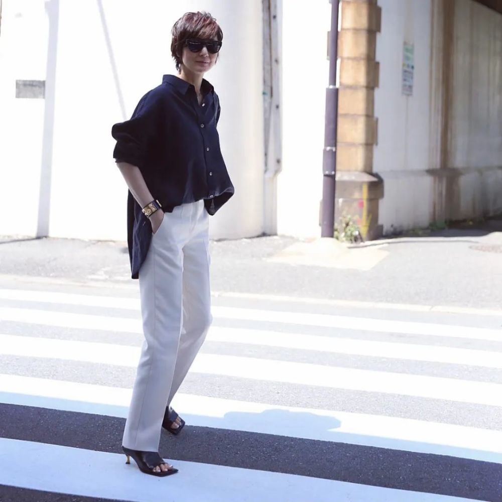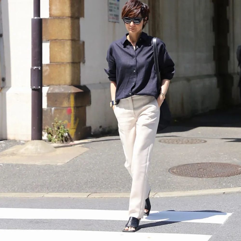 上周富冈的街拍一分为二的穿搭最简单。藏青色的衬衫帅气又冷酷,下面是一条米白色的长裤,配上墨镜和个性十足的包包,职场霸气女总裁无疑了。