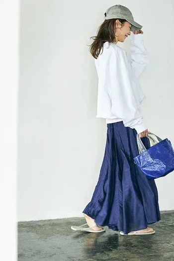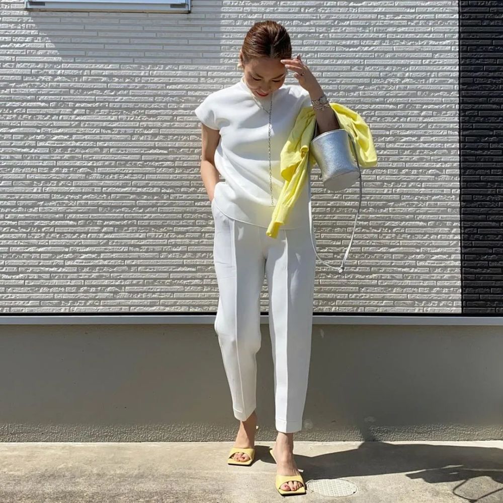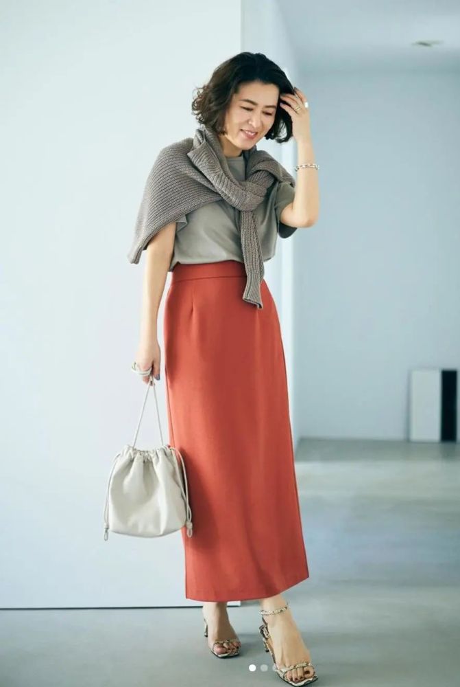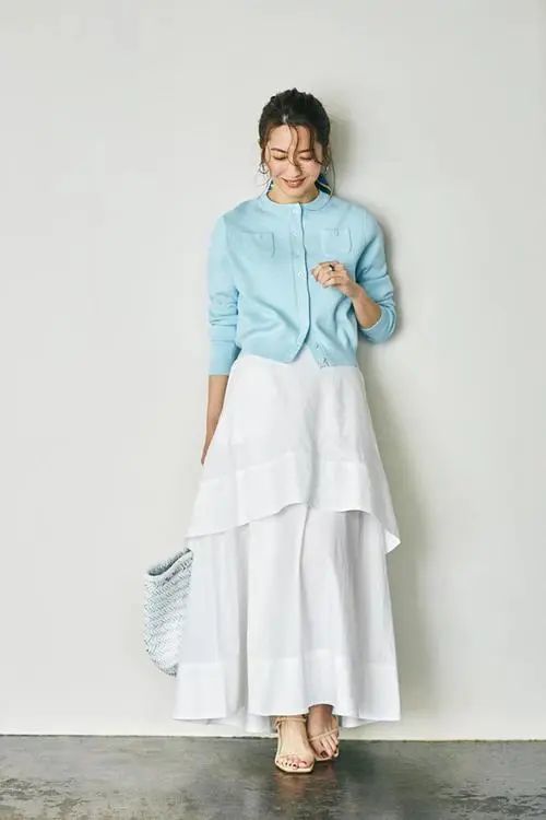 伊藤是所有博主里面配色最大胆的,而且上周她都选择了半身裙。第一套白色半身裙长到脚踝,身高只有160的她也没有因为这条裙子被压低格子,配色的清新和单品的长度很好的让她看起来很高。