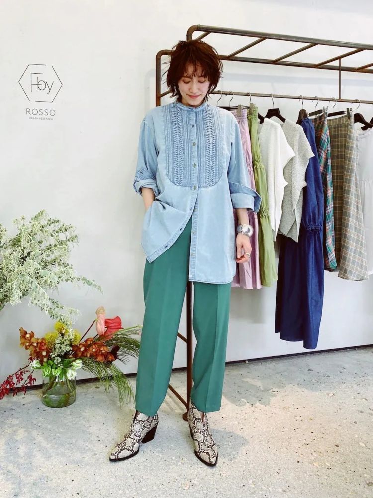 金子三上周两套搭配配色更大胆。第一套是红色和棕色的撞色混搭,第二套比较适合春天,蓝色丹宁衬衫和绿色西裤,更有春天的气息。