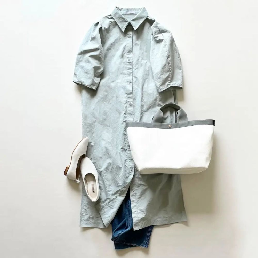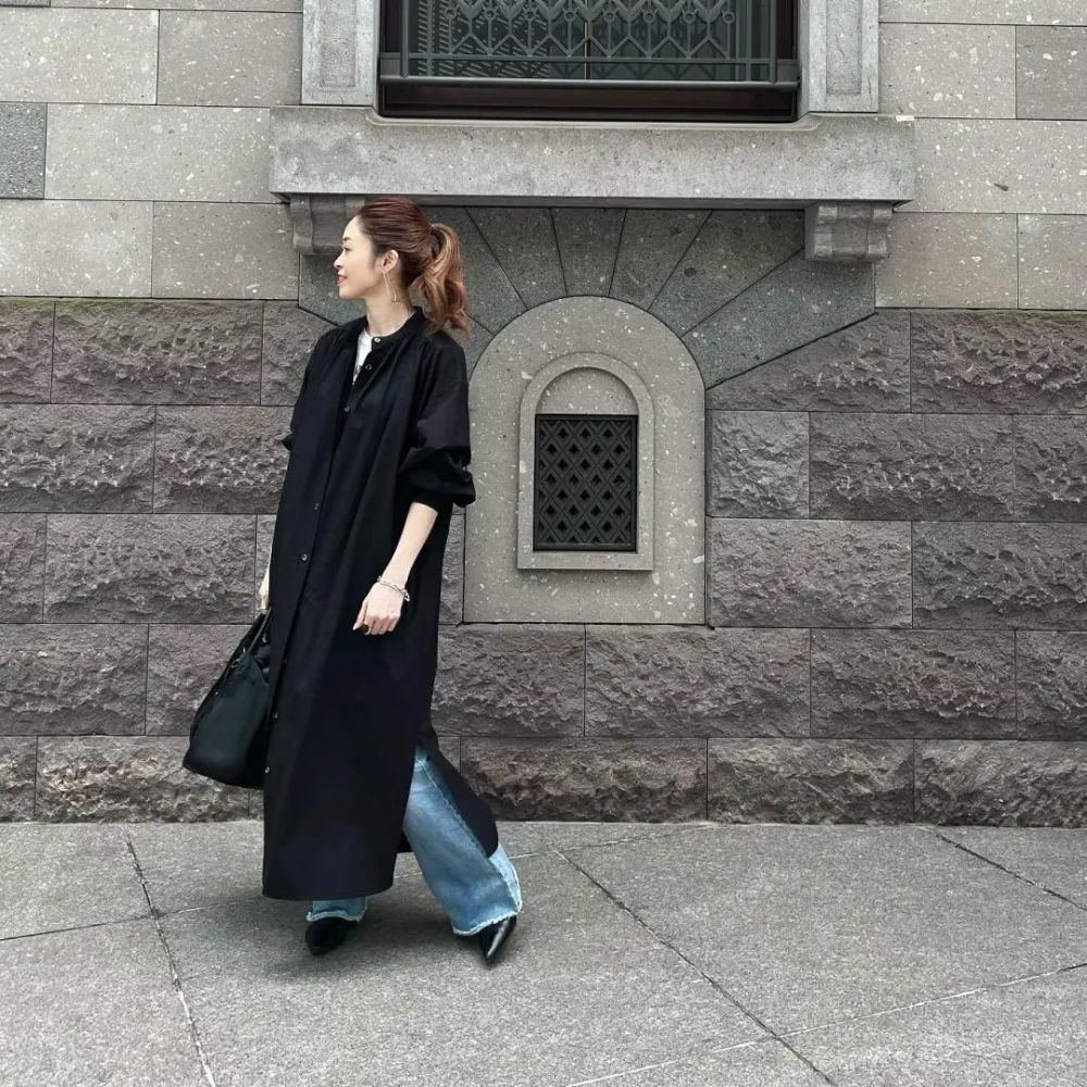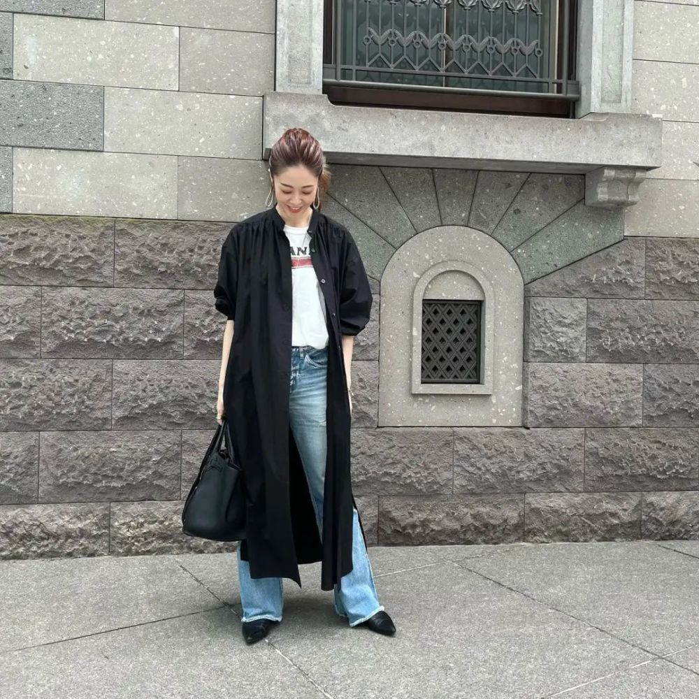 博主fumiko上周也是一分为二的穿搭,不过她把长款衬衫裙当作了外套,里面是白色T恤和仔裤,简单实用的同时也很另类。