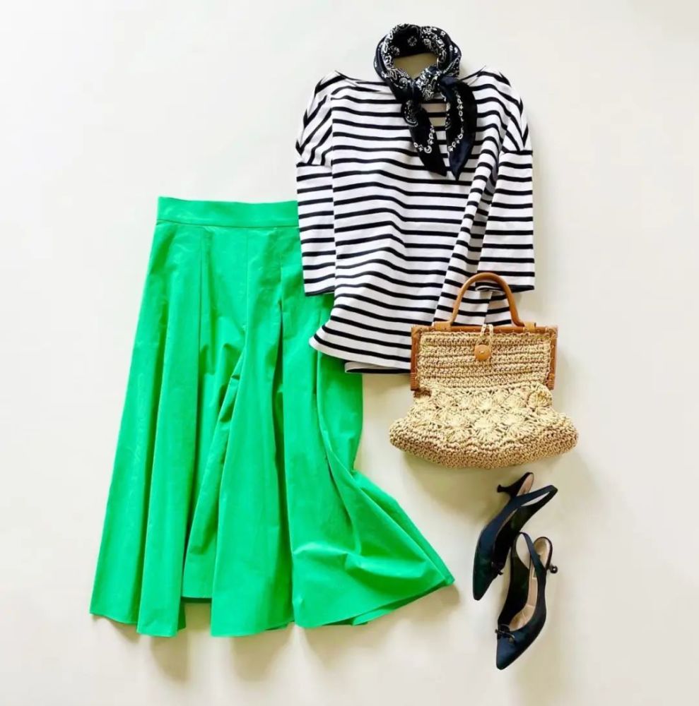 editorkao第一套比较适合喜欢穿裙子的女性,很简单的绿色半身裙,搭配条纹衫,就是膨胀色+基本款单品,是不是很好拷贝?