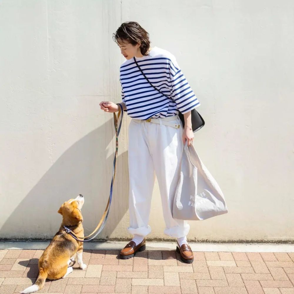 佐藤酱的搭配是极简实用中有亮点。比如绿色条纹衫搭配黑色长裤,简单又经典,但是要上那条心形腰带非常有个性,简单中有时尚度。