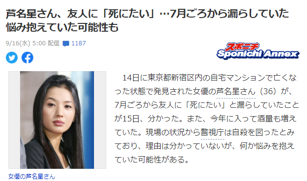 在9月16日也有日本媒体报道称芦名星曾在7月份的时候向好友透露过“想死”的念头,而且也是从今年开始酒量变大。据芦名星的朋友表示那时候也是得知三浦春马离开的消息不久,所以大家觉得可能是受到好友去世消息的打击,而且那之后芦名星的情绪也有好转,大家也觉得应该没事了……