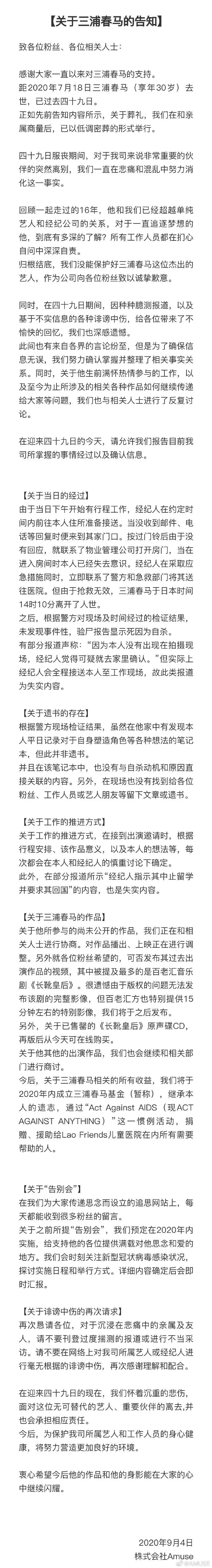 在三浦离开的49天,他曾所属的经纪公司AMUSE发布了官网声明。在声明中表示媒体的报道均不属实,三浦自杀的现场并没有留下遗书,而且也不是经纪人在拍摄现场找不到春马才去家里的,而是去接他的时候发现的异常。