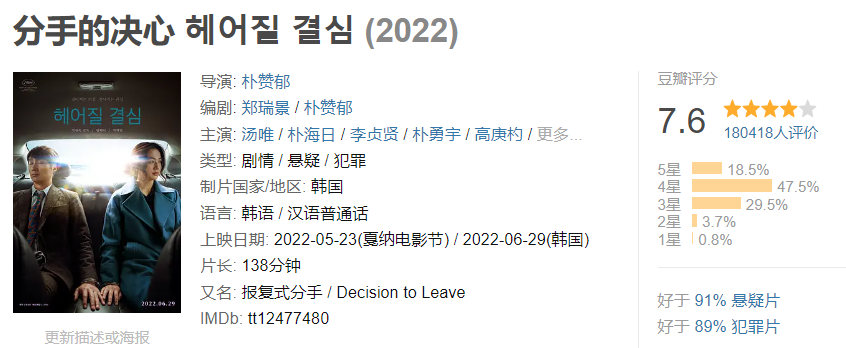 《分手的决心》是部文艺悬疑片,标准的韩式风格。