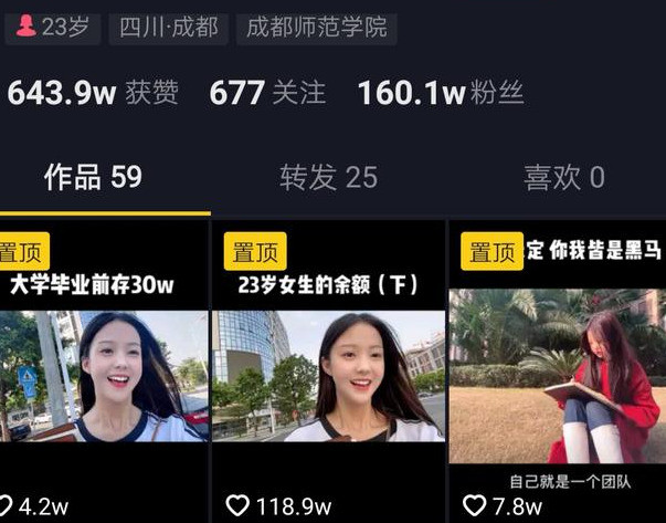 就这样,还在读大学的美希就已经赚了30万元,毕业后,她看准了短视频能发展,说干就干,一个人拿起三脚架带上手机,到处拍视频,拍摄、剪辑、文案自己全包,一个人就是一个团队,功夫不负有心人,现在她在某短视频平台已经拥有160多万粉丝,她拍的视频往往都有好几百万人观看,有不少上千万浏览量的,最多的一个视频竟然有1.5亿人点开过。