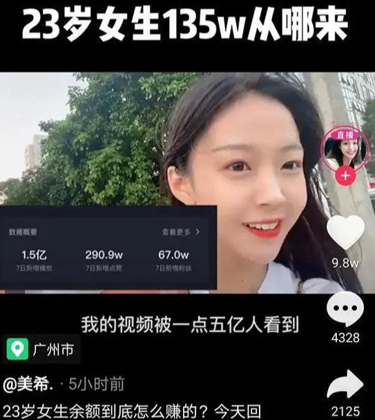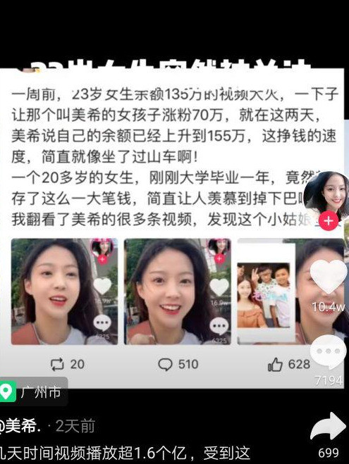 近日,23岁的美希在某视频平台晒出了她的银行卡存款,余额显示135万元。