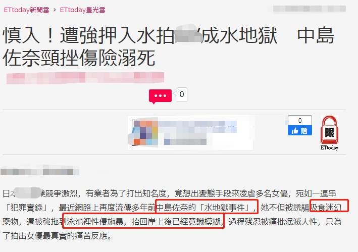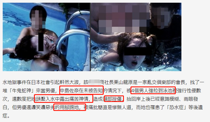 据媒体报道,当时中岛佐奈被骗吸食了毒品,随后她在不知情的情况下,被4个男演员强行拖到了泳池当中被人侵犯多次,还数次将中岛佐奈的头部压入到水中拍摄她痛苦的神情,造成了中岛佐奈脖子受伤。