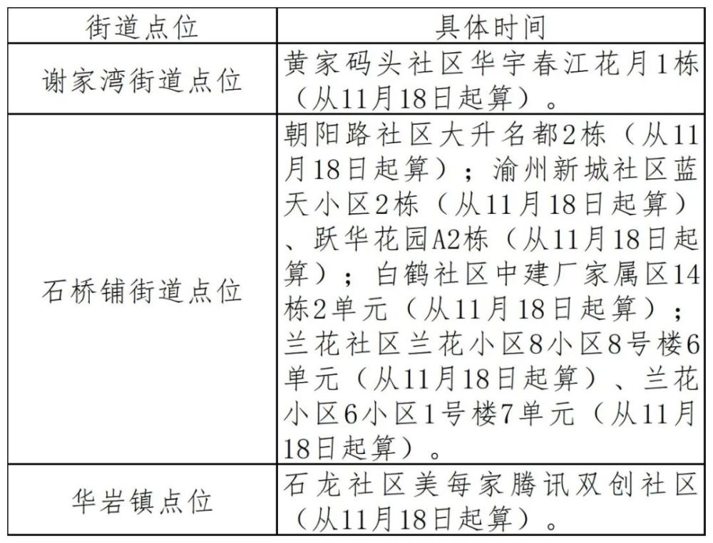 石桥铺街道点位:朝阳路社区大升名都2栋;渝州新城社区蓝天小区2栋、跃华花园A2栋;白鹤社区中建厂家属区14栋2单元;兰花社区兰花小区8小区8号楼6单元、兰花小区6小区1号楼7单元。