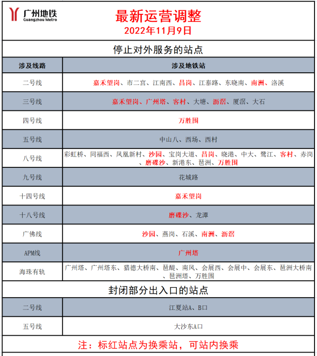 根据《广州市荔湾区新型冠状病毒肺炎疫情防控指挥部办公室关于划定风险区域的通告(第1号)》,为配合做好疫情防控,市交通运输部门于11月9日9时起,暂停站前街道、西村街道、南源街道、彩虹街道全域地铁公交服务,具体调整措施如下: