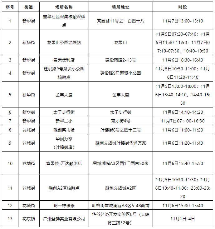 8日20时许,广州市从化区疾病预防控制中心发布通告:因疫情防控需要,请在相关时段到过以下重点场所的人员,立即向所在社区报备,开展“三天三检”自我健康监测,并配合做好疫情防控措施。重点场所名单见下表,后续将按实际情况更新。