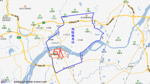 因疫情防控工作需要,自2022年11月8日22时起,东至清晖北路、新河、文洞河,南至清远大道,西至城西大道、飞来南路、笔架河,北至笔架山、二帽山山脚范围内为风险排查区(详见附图蓝线区域)。
