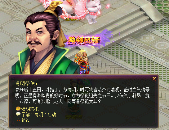 ●前往【清明祭使】处领取任务,任务共分为找寻无主之灵和驱赶贪玩的游魂两种,领取任务的时候会在这两个任务中随机抽取一个出来。