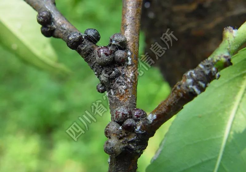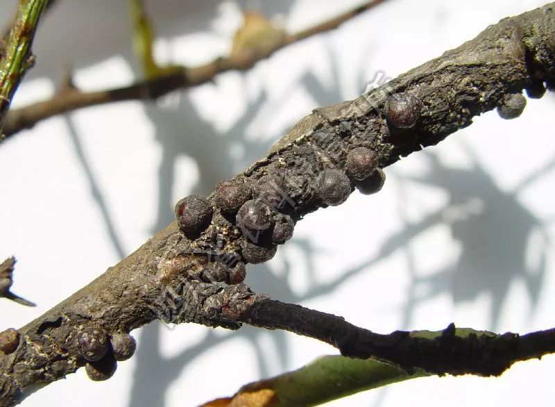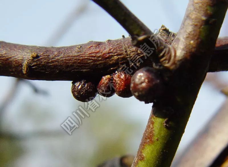 1)发生特点:朝鲜球坚蚧以成虫、若虫固定在树体枝条上吸食汁液,枝条受害后皮层坏死干瘪凹陷,严重的造成枝条干枯死亡。该虫1年发生1代,以2龄若虫在枝条上越冬。次年3月中下旬开始活动,群集在小枝上。4月上旬虫体开始膨大,分散为害,体背分泌蜡质。4月下旬是羽化盛期,雌雄交尾后,雄虫很快死亡,雌虫开始分泌黏液。5月上旬雌虫体逐渐变硬,形成介壳。5月上旬雌虫开始产卵,卵在5月中下旬开始孵化为若虫,孵化盛期在5月底至6月初。孵化出的若虫爬行到枝条、叶片和果实上为害,以2年生枝条上最多,到9月落叶前,若虫迁回到枝干上,分泌一层白色蜡质开始越冬。