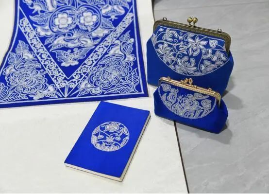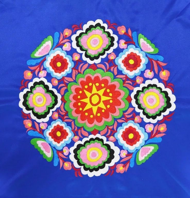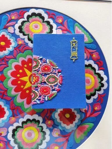 羌绣作品灵感源于羌族最典型的代表图腾“团花”,设计者将对团花内涵的理解融入设计中,创作出富有羌族文化特色的设计图案。羊角花是羌族的族花,代表着幸福美满,象征着爱情的到来,洋溢着有情人终成眷属的祝福。
