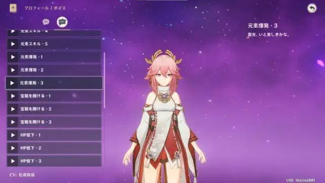动作语音中我也挑选了两句。第一句是“元素爆发3”的语音,原文为“雷光凄美啊”。日文翻译为「雷光(らいこう)、いと美しきかな。」看到いと、美しき就知道是古典的表达。