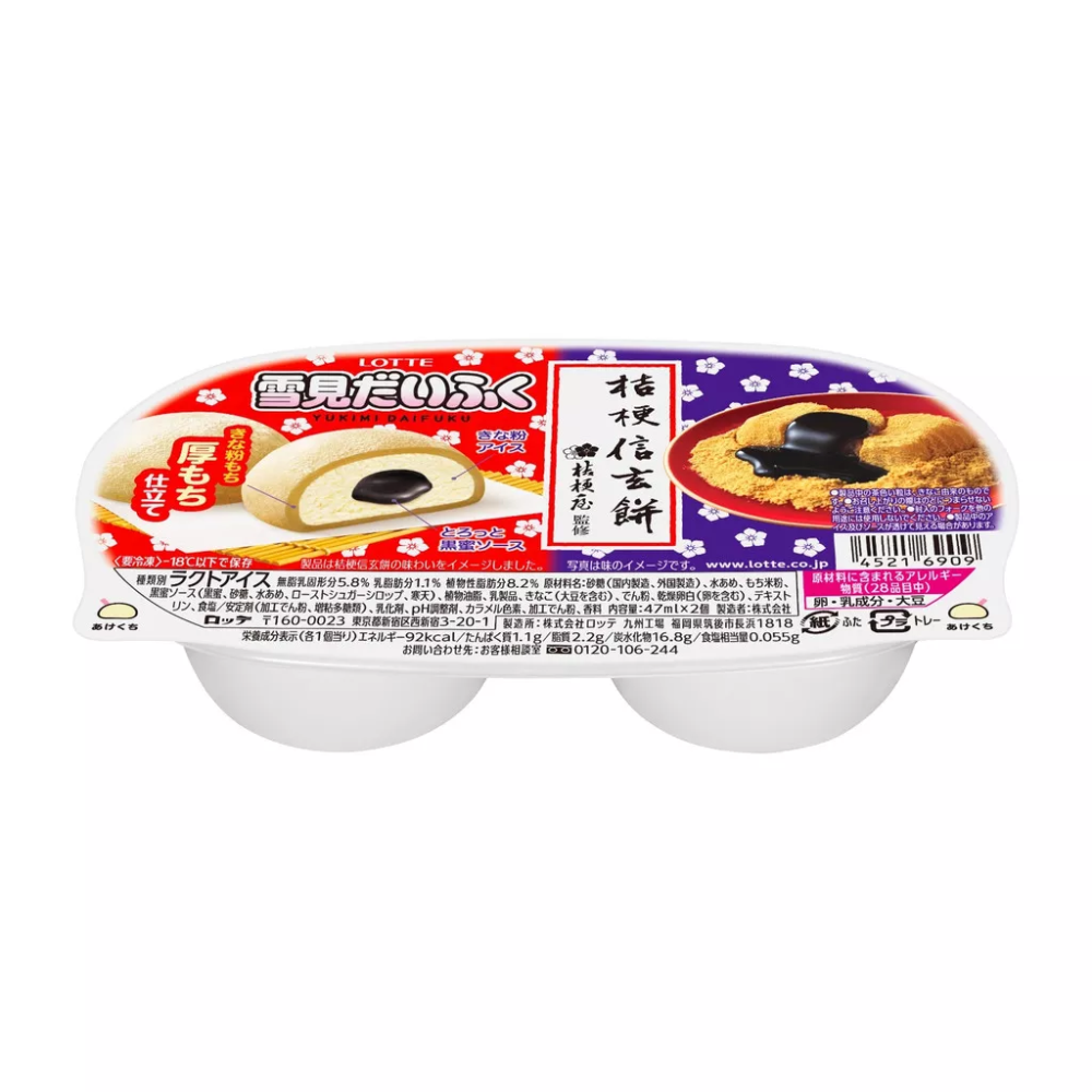 该产品是“雪见大福”与桔梗屋“桔梗信玄麻糬”的梦幻合作特别款。灵感来自“桔梗信玄麻糬”的味道,kinako冰淇淋和kinako麻薯中包裹着浓稠的黑色蜂蜜酱,冷冻后口感依然柔软。