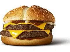 汉堡中有两层香烤100%厚牛肉和浓郁的切达干酪,上面覆盖香脆的洋葱片,夹在香喷喷的烤面包中。