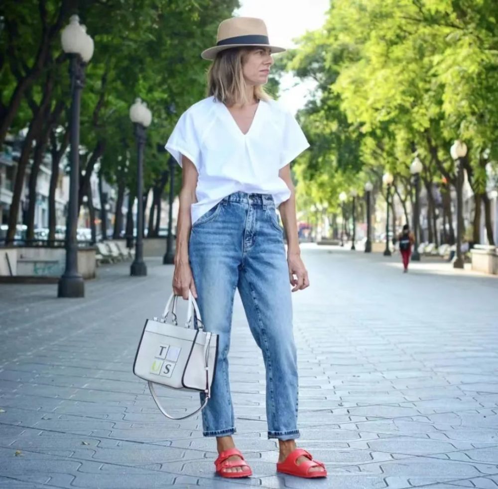 rocio的搭配还是值得下半身胖、走运动风格的人参考。锥形牛仔裤搭配白色V领衬衫,加入一定帅气的草帽,休闲随意又带着中性风格,而红色有个性的凉鞋让整个搭配更有亮点。