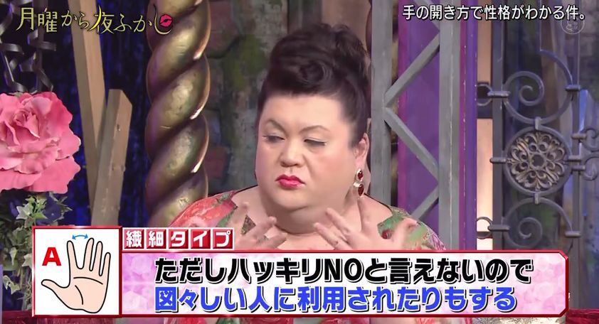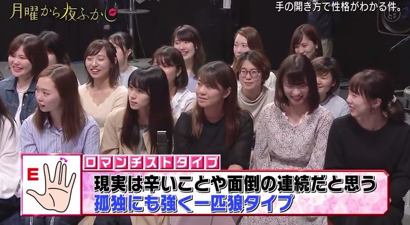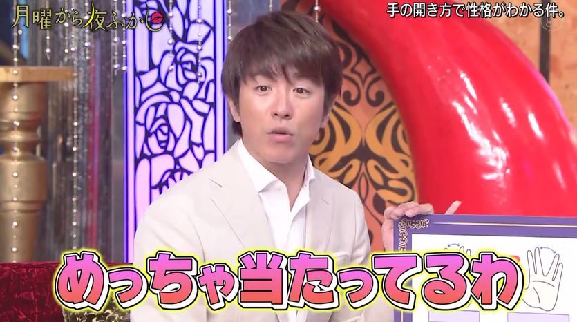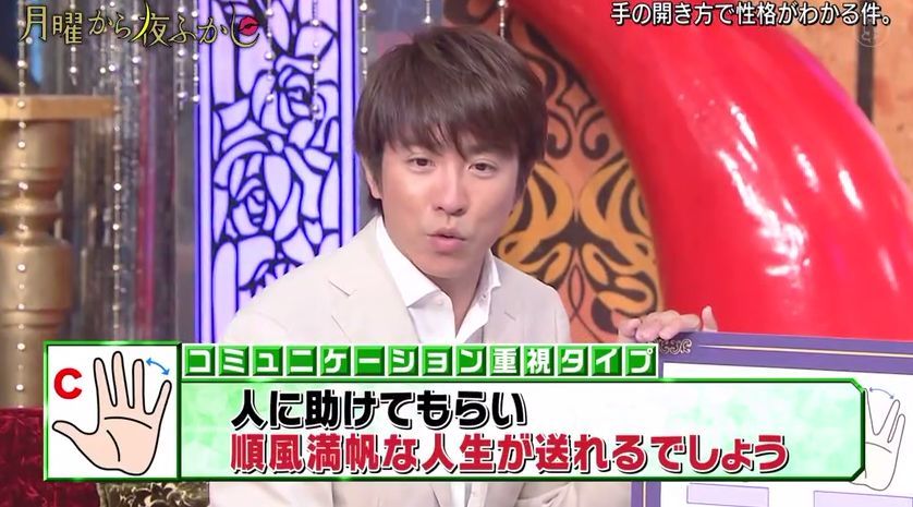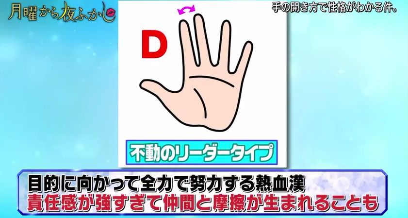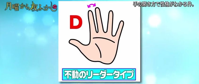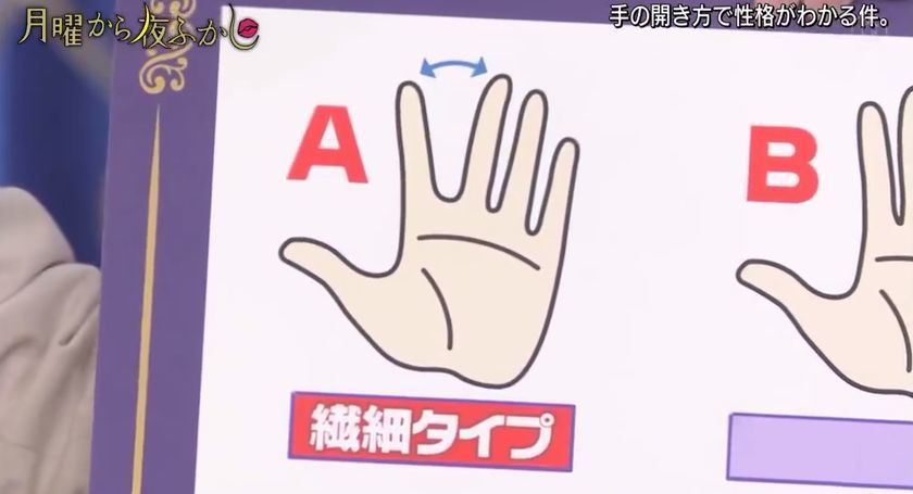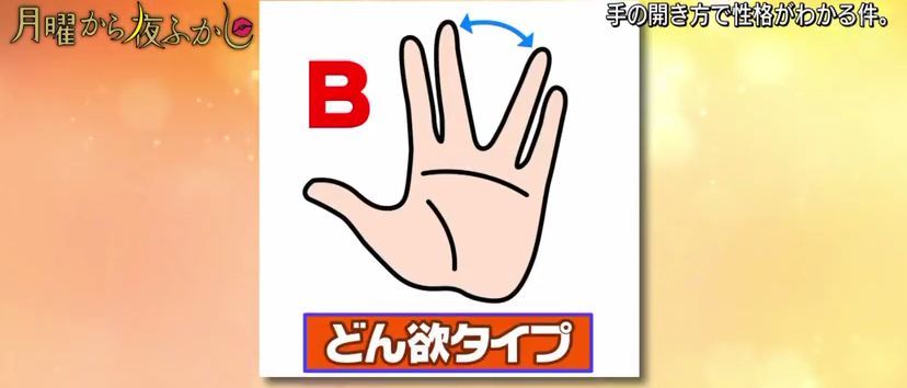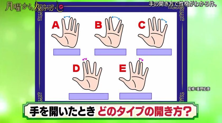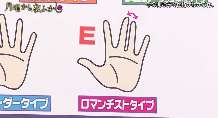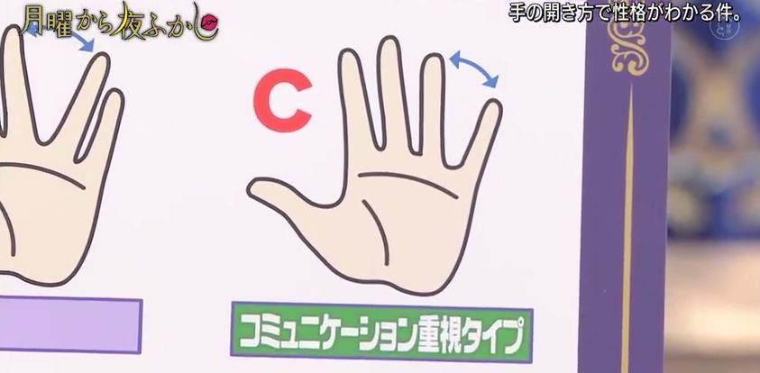 最近,日本超会玩的综艺『月曜から夜ふかし』又出了一个很火的测试,通过伸出手掌时五指间的角度来判断性格。
