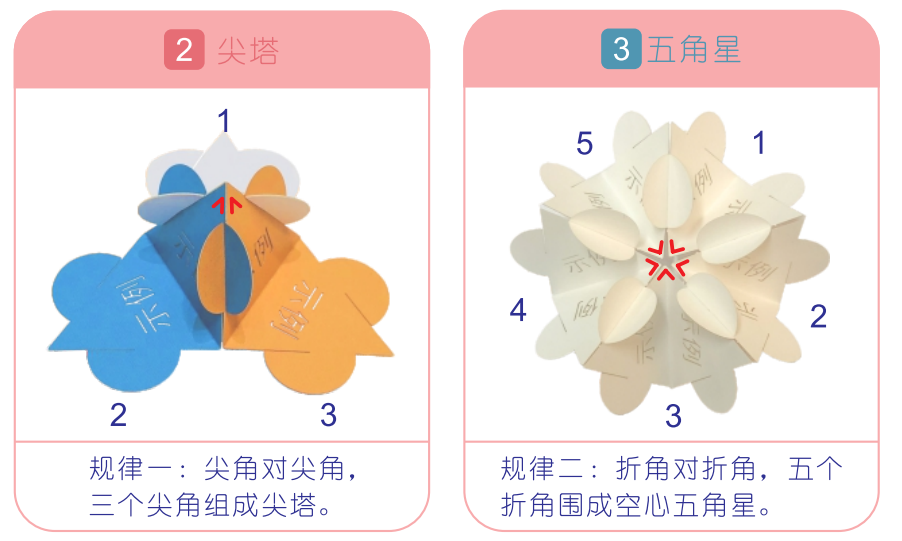 拼装灯球这里有个小诀窍,想着三个尖角组成金字塔,对折角围成一个五角星就非常简单,一直按照这个逻辑拼完30片灯球片,一个完整圆润的灯球就出现啦!