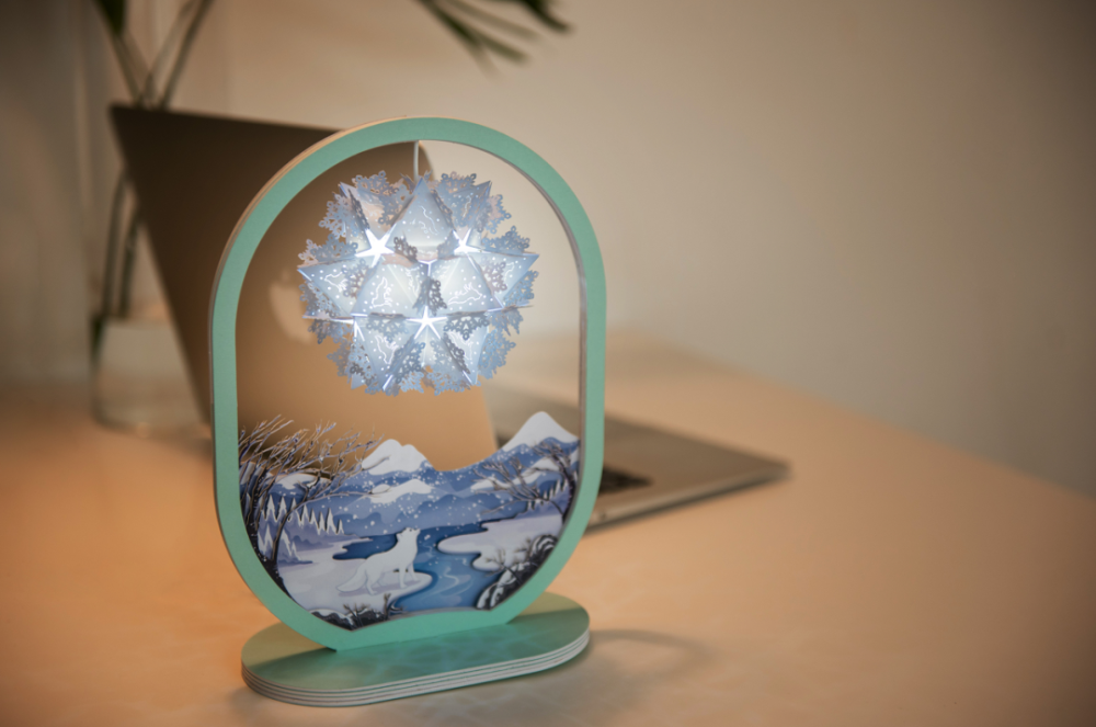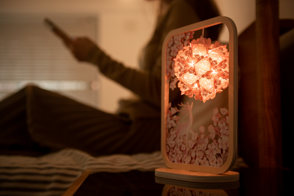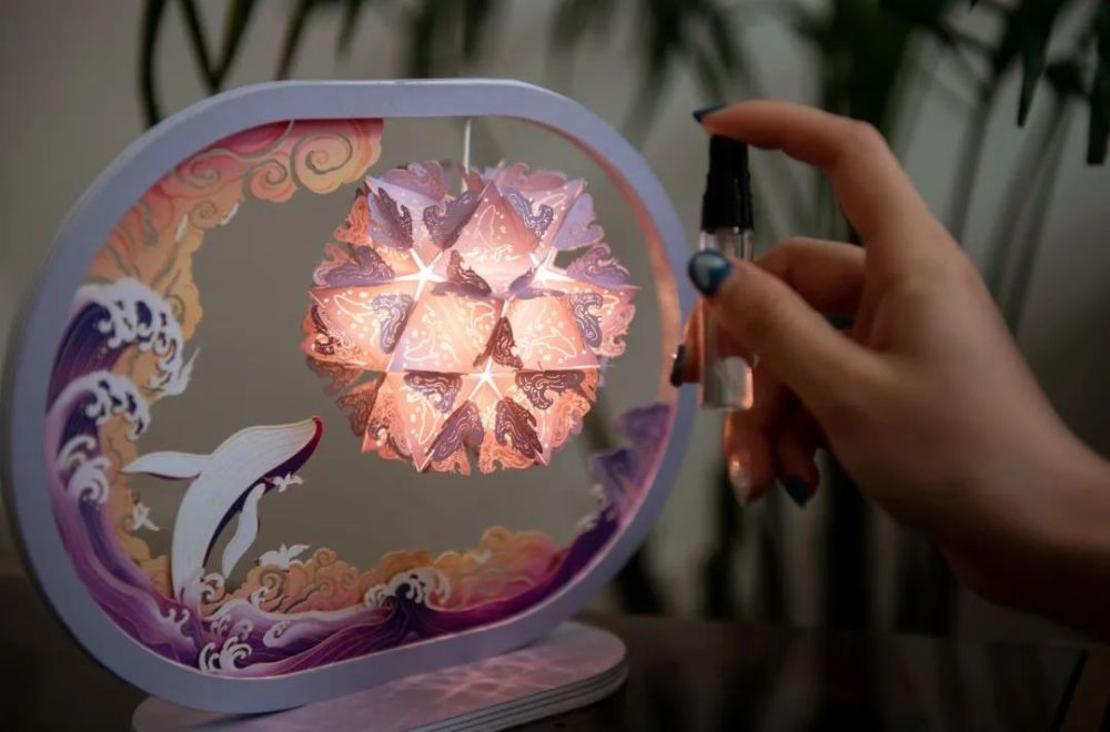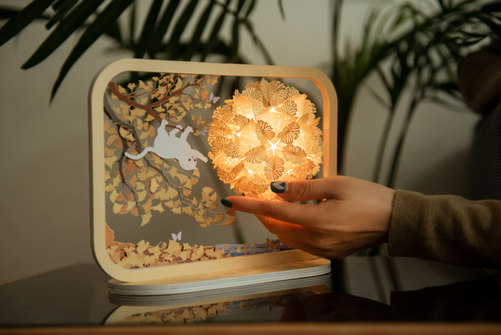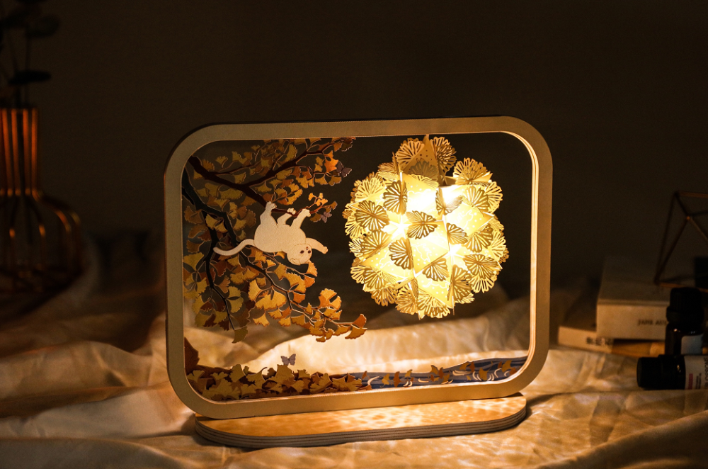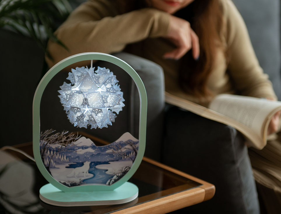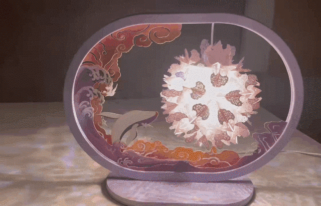 纸艺激光雕刻技术把每个设计细节都剪裁的很细致,灯光透过细致雕刻的纸片,在桌面上铺撒一副朦胧浪漫的光影交错画,氛围感满的好像要从屏幕里溢出来。