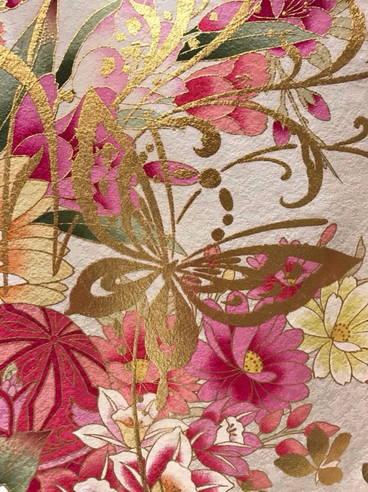 和柄一般可以分为小纹柄和绘羽两种。小纹柄就是不断重复的简单的小图案;绘羽则是展开之后像是一幅完整的绘画作品的华丽图案,在振袖和服上比较常见。