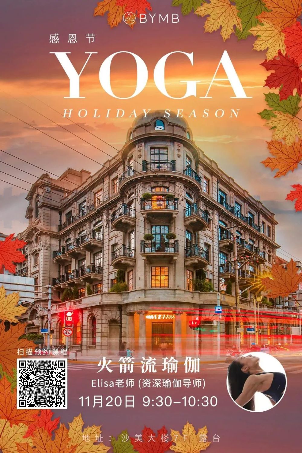 Elisa老师则将伴随着慵懒惬意秋天节奏,以舒心的后弯类主题帮助练习者拥有身心舒爽的愉悦感受。
