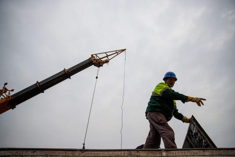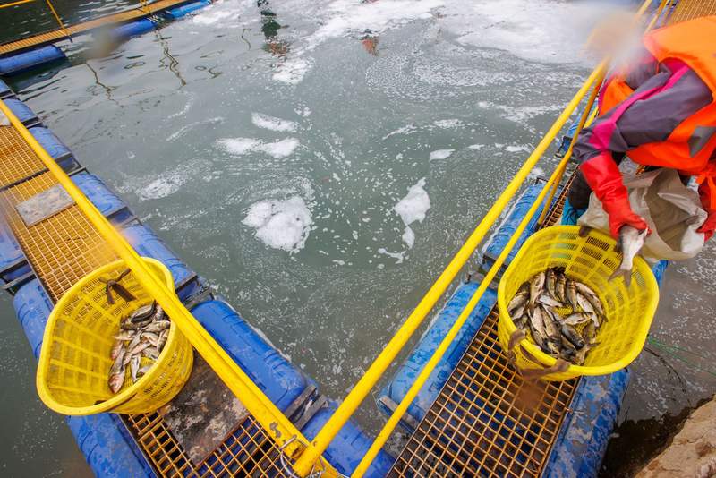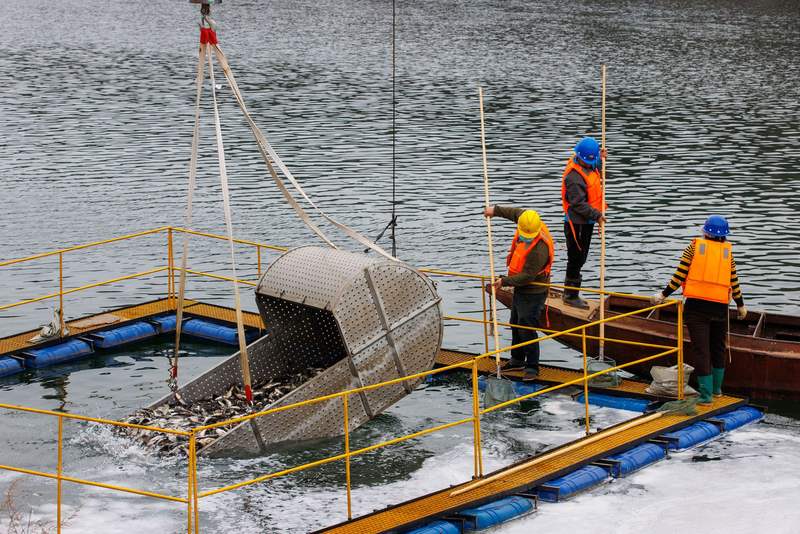 起重机旋转吊臂,将蜗壳式投放筐中的鱼苗放入水体里的投放区。投放区周围站着拿长柄网兜的工人,要有意外死掉的鱼苗,会被这些工人及时捞出来,放进塑料箱里。