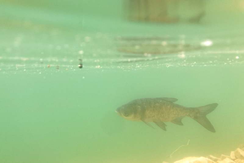4月3日,放入水库的鱼游出投放区,进入水库。(水下拍摄)