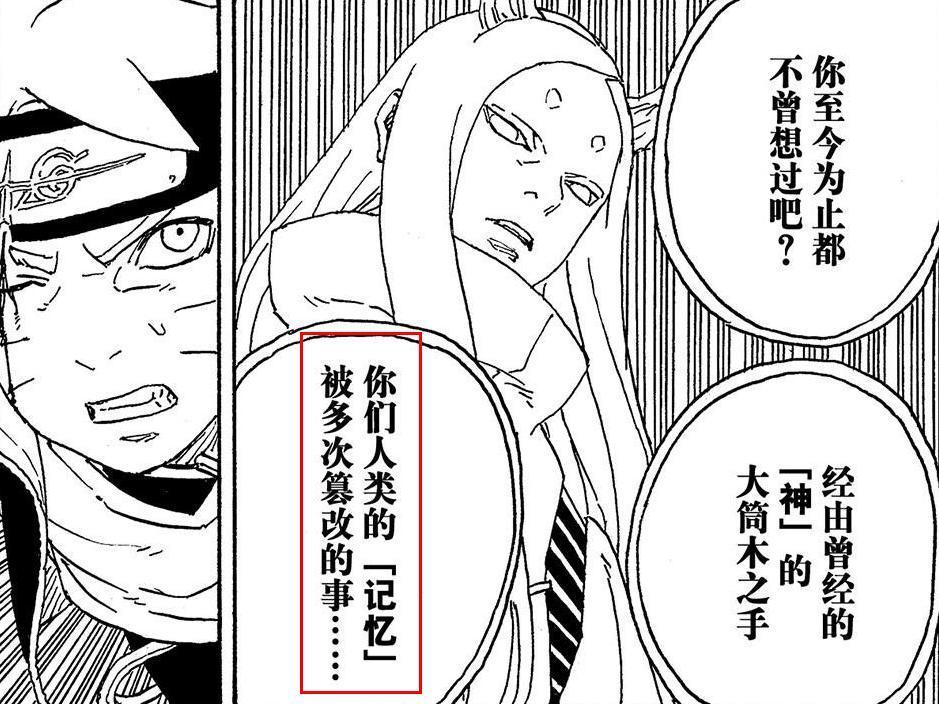 但其实除了这个爆炸情节以外,剧情中还有一个地方非常值得我们注意。在大筒木桃式给博人讲解艾达的能力时,他曾经说过一句话“你至今为止都不曾想过吧,经由曾经的神的大筒木之手,你们人类的记忆被多次篡改的事”。