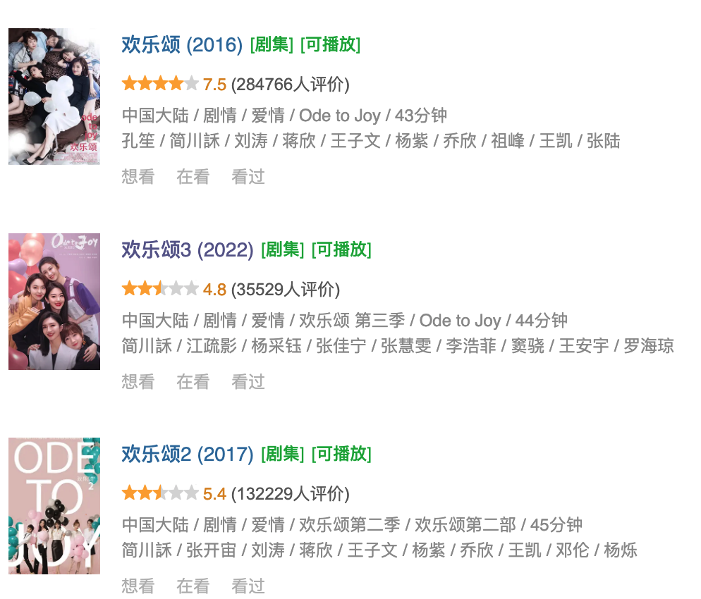 虽然幕后班底是同一个,都是正午阳光的王牌组合。但是《欢乐颂》的评分是一季不如一季,到第三季就已经跌破及格线了。