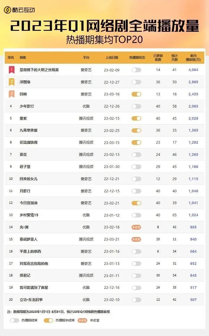 Q1网络剧整体体量缩短,网络剧热播期集均播放量TOP20剧集平均集数为27.55集。其中《显微镜下的大明之丝绢案》以14集体量,4064万集均播放量位列第一;《浮图缘》36集体量,2965万集均播放量位列第二;《回响》13集体量,2435万集均播放量位列第三。榜单前三剧集均由爱奇艺独播。