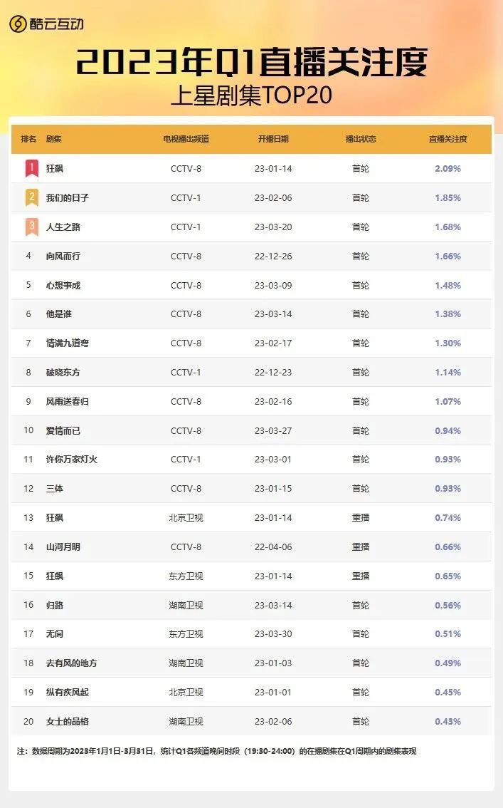同时Q1剧集多轮上星现象显著,《狂飙》《山河月明》《对手》等剧多次上星播出,直播关注度表现良好。