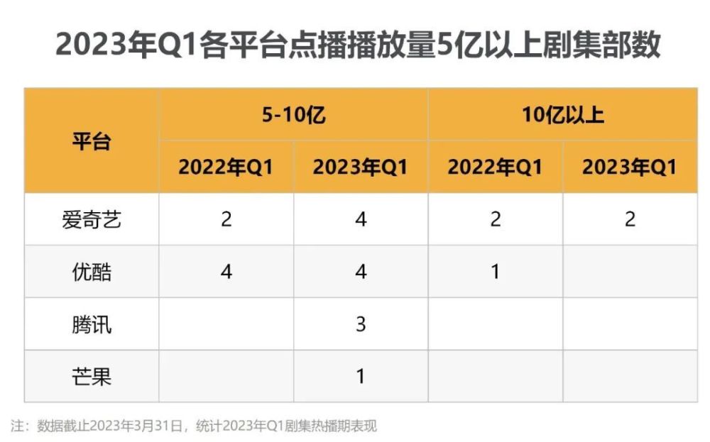2023年Q1网络剧集仍以独播模式为主,网络剧热播期播放量TOP20中,爱奇艺9部剧集上榜,腾讯视频7部剧集上榜,优酷4部。