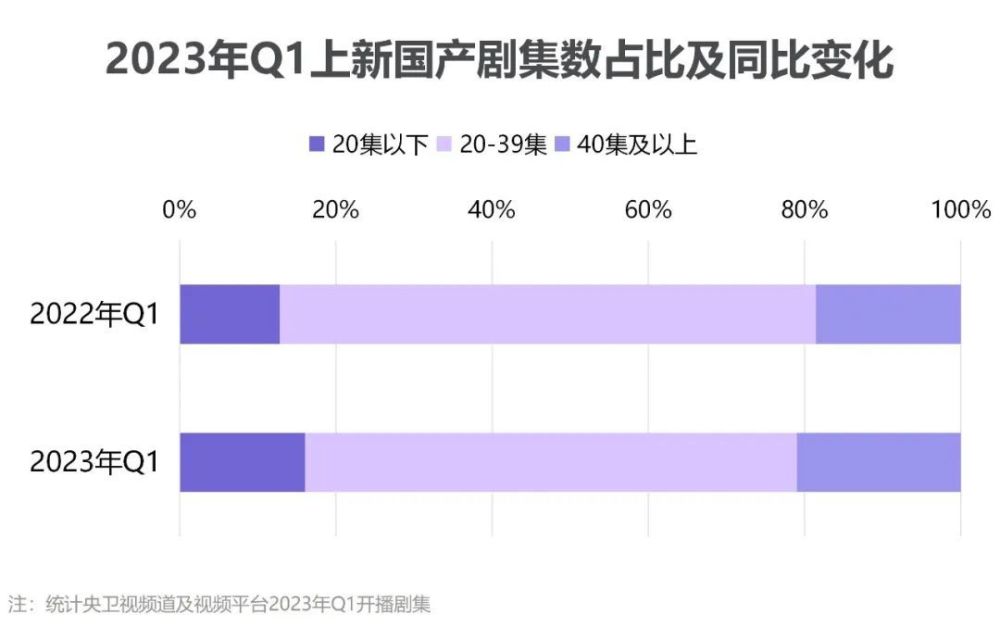 2022年12月,国家广播电视总局发布了《关于推动短剧创作繁荣发展的意见》,鼓励单集时长15-30分钟的系列剧、集数在6集内的系列单元剧、20集内的连续剧、周播剧等多种形态短剧的发展。2023年Q1上新国产剧集20集以下占比16.05%,同比上涨3.19%;20—39集剧集占比62.96%,同比下降5.61%。