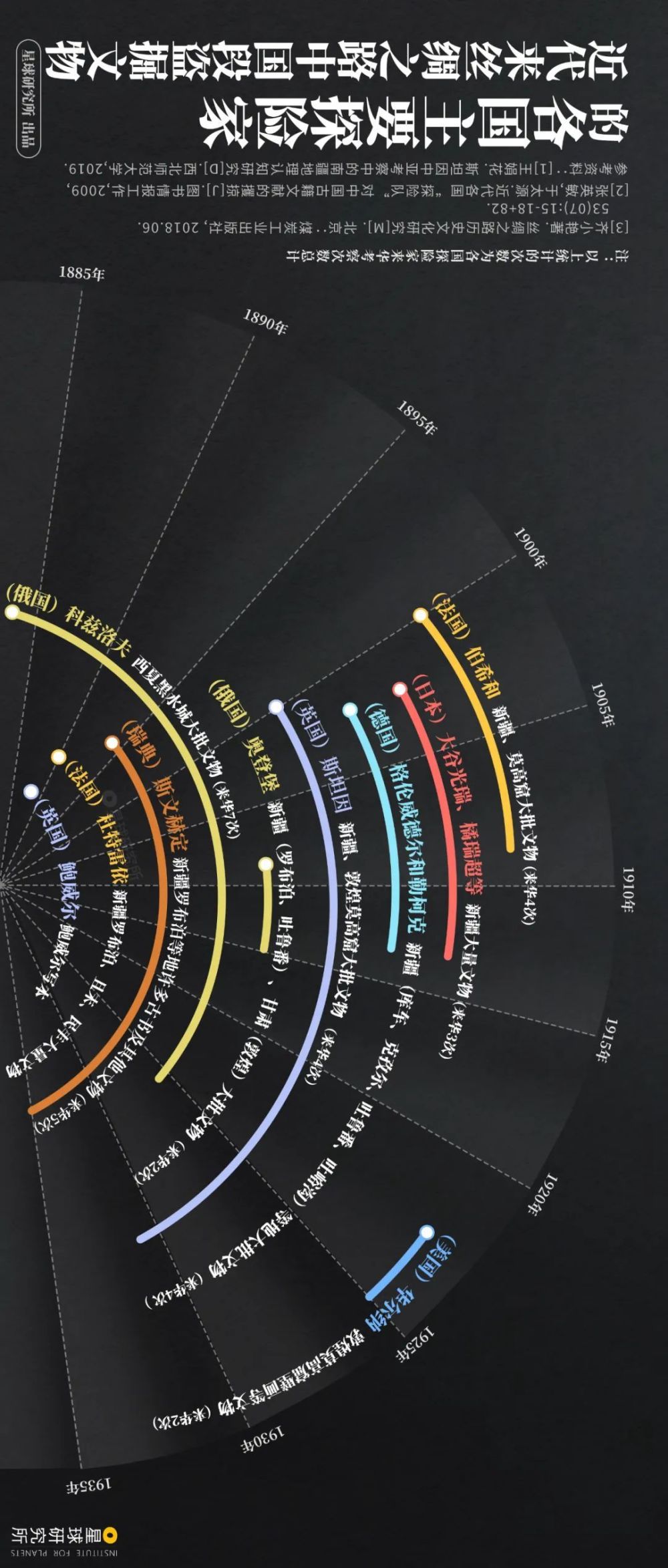 (请横屏观看,近代来丝绸之路中国段盗掘文物的各国主要探险家,制图@李雪茜/星球研究所)