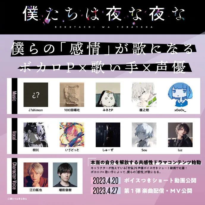 ボカロP×歌手×声优全新企划《僕たちは夜な夜な》公开了预告PV。声优增田俊树、江口拓也,ボカロP雄之助等参加了企划。