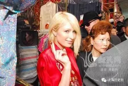图12-15:下午1点10分,希尔顿在城隍庙一下车,便直奔一家唐装店。在店中,希尔顿先是试了一件红色丝绸睡衣,之后又穿上一件白色带有大红花刺绣的短袖唐装,看见记者,希尔顿很自然地摆起各种POSE。